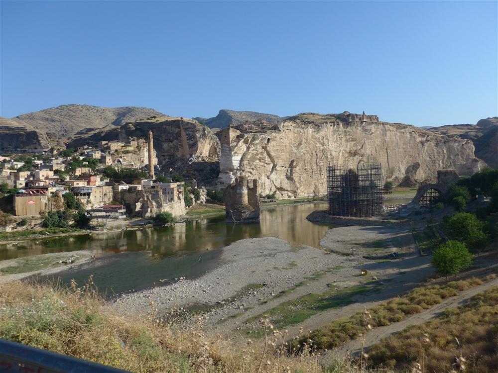Wie ich schon bei meinen letzten Besuchen mitbekommen habe, sind die meisten hier mehrsprachig. Und zwar nicht nur Kurdisch und Türkisch. Der Sohn von Bülent, der im Jahr meines ersten Besuches (2003) zu Welt kam, spricht auch ein wenig Arabisch. Englisch kann er recht wenig, ich lasse durch seinen Vater aber übersetzen, dass er das auf jeden Fall auch noch lernen soll. Er sagt mir auch, warum letzte Woche so viele Kinder vor Ferienbeginn nicht in der Schule waren: in der letzten Wochen gibt es einfach nichts Wichtiges in der Schule, da wird man halt auch mal in der Familienarbeit eingesetzt. Ebenso berichtet er mir, dass er das Café am Fluss vor 4 Jahren schließen musste, etwa zur gleichen Zeit mussten die Bewohner im Bereich der 10.000 Jahre alten Siedlung ihre Felswohnungen verlassen und das ganze Gebiet wurde abgesperrt. Auf legalem Weg kommt also nicht mehr dorthin und ins antike Felsendorf. Ansonsten hat sich hier noch nicht viel verändert. Die Stadt steht noch, der Fluss führt noch kein höheres Wasser als früher. Aber ich bin mir echt nicht sicher, wie das hier weitergehen wird. Einer der alten römischen Brückenpfeiler wird gerade renoviert. Früher war hier nicht so viel Tourismus. Die meisten Besucher sind Türken, im Winter kommen wohl viele aus Südostasien. Ihre Zahl ist für diese kleine Stadt zwar recht groß, aber trotzdem überschaubar. Und eigentlich finde ich es gut, dass sie hier sind, obwohl sie die eigentlichen uralten Schätze der Stadt gar nicht besichtigen können.