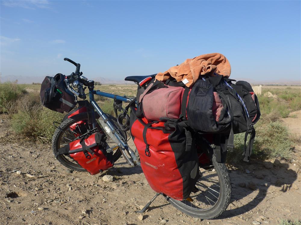Wie gestern stehe ich sehr früh auf und verlasse das Gelände „Salafchegan Especial Free Zone“. So fahre ich an den beiden Pförtnern vorbei, die mich gewähren lassen. Heute sollte ich einen neuen Rekord aufstellen. Denn die 230 Kilometer bis Isfahan haben nicht viel zu bieten und wenn ich keine großen Pause einlege, ist dies auch möglich. Anfangs habe ich eine sehr schöne Strecke. Und nach 45 Minuten habe ich einen phantastischen Schnitt von 28 km/h. Ich träume von einem Schnitt von 25 km/h, womit ich es sehr gut schaffen würde, vielleicht sogar noch vor Sonnenuntergang. Allerdings habe ich nach 45 Minuten auch einen Platten, den zweiten der Tour. Ausgerechnet heute. Wenigstens passiert dies an einem Fleck, an dem es etwas steil die Straße hinunter geht, wo es schattig ist. So mache ich mich ans Flicken, merke aber beim Wiederaufpumpen, dass es wohl noch eine zweiten Platten gibt – so wie damals kurz vor der Ankunft in Kappadokien. Also das ganze noch mal von vorne. Damit ist eine ganze Stunde vergangen. Ich lasse mich deswegen aber nicht unter Druck bringen. Die Chance, heute noch in Isfahan anzukommen, wird also geringer, besteht aber noch. Ich fahre also weiter und habe nach einer schweren Weiterfahrt doch wieder irgendwann Rückenwind. Doch das Pech kommt durch eine andere Tür angeschlichen: Mit dem schnellen Einkaufen wird es nichts. Ich will nur Tomaten kaufen, es gibt bei den wenigen Häusern hier aber ausnahmsweise nur Restaurants und Kioske mit Süßwaren. Nirgends Tomaten oder Brot, wie kann das sein? Somit verzögert sich die Weiterfahrt noch mehr und ich gebe das vorgenommene Ziel Isfahan bald auf. Dazu wird es wieder ziemlich heiß.
