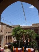 Danach gehe ich zurück zum Hotel und packe meine Sachen. Besonders viel ist es nicht mehr: während meiner Fahrt habe ich die zwei Trinkflaschen verloren, mehr als zwei Plastikflaschen brauche ich nicht mitzunehmen. Außerdem habe ich mich unterwegs einiger Kleider entledigt, entweder meinen Eltern geschickt oder sie fortgeschmissen, wenn sie alt und verbraucht waren. Genau so die Lenkertasche, die nach vielen Touren ihren Dienst nun getan hat. Nach dem schnellen Packen verlasse ich das Zimmer. Daß fast alle meine Unterkünfte, auch Neubauten, Stuckaturen an der Decke haben, ist mir erst ab der Türkei aufgefallen. Eigentlich könnte ich jetzt im Hof Berichte schreiben, Zeit hätte ich genug. Aber ich habe einfach keine Lust, lieber mache ich es mir gemütlich und schlafe noch mal ein wenig. Am Nachmittag gehe ich noch mal zum selben Restaurant wie gestern. Dort ist auch eine Gruppe polnischer Touristen. Mit der einzigen jungen Frau komme ich ins Gespräch, da sie auch Interesse hätte, mal alleine in den Iran zu reisen.